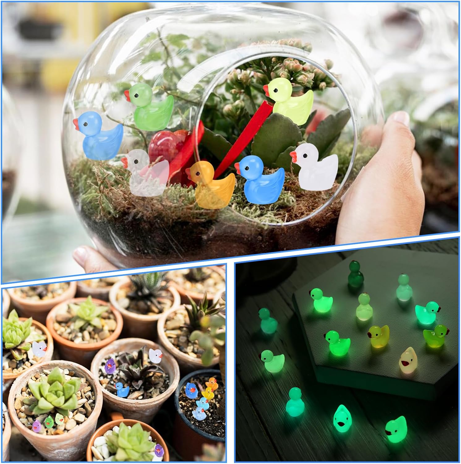 【Glow in The Dark】Mini colorful resin ducks have a unique luminous effect. They can illuminate at night after absorbing enough sunlight during the day. The stronger the ultraviolet rays they absorb, the brighter they glow in the dark. It needs to be illuminated for a few minutes before use, so that the ducks will shine longer!